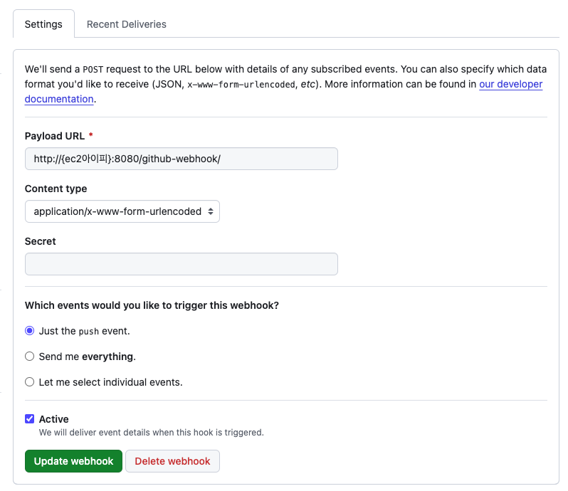 다음과 같이 입력 후 웹 훅을 만들면 깃허브에서 브런치의 변경사항을 감지하고 payload URL에 web hook을 날립니다.