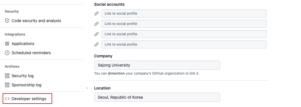 깃허브 계정에서 setting에 들어가서 왼쪽 하단에 있는 developer setting에 들어가줍니다.