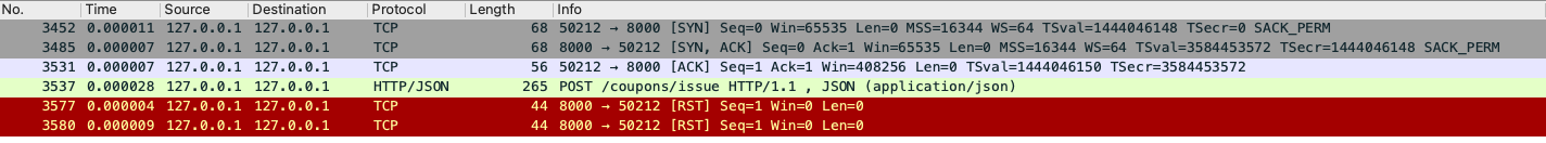 WARN[0000] Request Failed error="Post \"http://localhost:8000/coupons/issue\": read tcp 127.0.0.1:63446->127.0.0.1:8000: read: connection reset by peer"