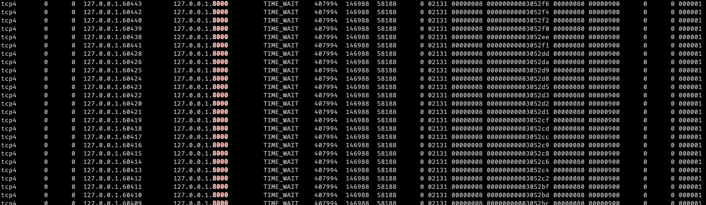 -> 서버에서 사용하고 있는 8000번 포트의 TCP 연결 상태를 모니터링하여 수신 버퍼 상태를 확인했지만 문제가 없음을 확인했고, 혹시나 하는 마음에 수신 버퍼의 크기를 최대로 늘려 다시 부하테스트를 진행했지만 여전히 똑같은 상황 발생 - 원인 x