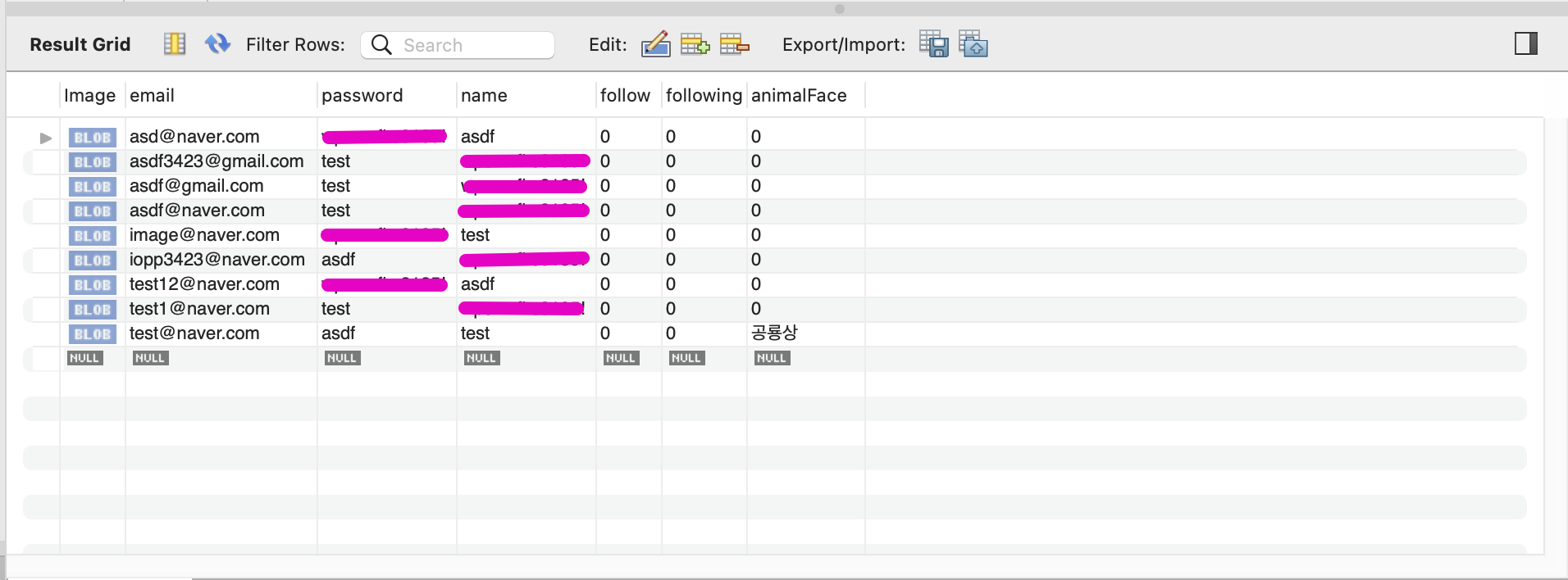 image컬럼은 사진 데이터가 클 수도 있기 때문에 longblob으로 작성했다.